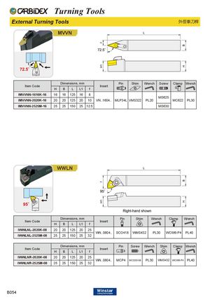 Turning Tools External Turning Tools 外徑車刀桿 MVVN Dimensions, mm Pin Shim Wrench Screw Clamp Wrench Item Code Insert H B L L1 f IMVVNN-1616K-16 16 16 125 16 8 MS625 IMVVNN-2020K-16 20 20 125 20 10 VN..1604.. MLP34L VMS322 PL20 MC622 PL30 IMVVNN-2525M-16 25 25 150 25 12.5 MS630 WWLN Dimensions, mm Pin Shim Wrench Clamp Wrench Item Code Insert H B L L1 f IWWLNL-2020K-08 20 20 125 20 25 WN..0804.. SCO418 WMS432 PL30 WCW6-P4 PL40 IWWLNL-2525M-08 25 25 150 25 32 Dimensions, mm Pin Screw Wrench Shim Clamp Wrench Item Code Insert H B L L1 f IWWLNR-2020K-08 20 20 125 20 25 WN..0804.. MCP4 MCS3S-08 PL30 WMS432 WCW6-P4 PL40 IWWLNR-2525M-08 25 25 150 25 32 B054