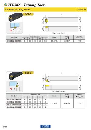 Turning Tools External Turning Tools 外徑車刀桿 SCBC Dimensions, mm Clamp Wrench Item Code Insert H B L L1 f ISCBCR/L-2020K-09 20 20 125 20 17.5 CC..09T3.. MS4011A TF15 SCKC Dimensions, mm Clamp Wrench Item Code Insert H B L L1 f ISCKCR/L-1212K-09 12 12 125 12 16 ISCKCR/L-1616K-09 16 16 125 16 20 CC..09T3.. MS4011A TF15 ISCKCR/L-2020K-09 20 20 125 20 25 ISCKCR/L-2525M-09 25 25 150 25 32 B056