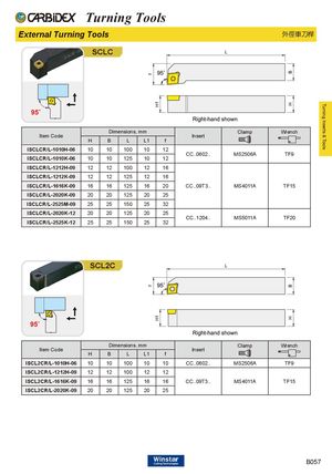 Turning Inserts & Tools Turning Tools External Turning Tools 外徑車刀桿 SCLC Dimensions, mm Clamp Wrench Item Code Insert H B L L1 f ISCLCR/L-1010H-06 10 10 100 10 12 CC..0602.. MS2506A TF9 ISCLCR/L-1010K-06 10 10 125 10 12 ISCLCR/L-1212H-09 12 12 100 12 16 ISCLCR/L-1212K-09 12 12 125 12 16 ISCLCR/L-1616K-09 16 16 125 16 20 CC..09T3.. MS4011A TF15 ISCLCR/L-2020K-09 20 20 125 20 25 ISCLCR/L-2525M-09 25 25 150 25 32 ISCLCR/L-2020K-12 20 20 125 20 25 CC..1204.. MS5011A TF20 ISCLCR/L-2525K-12 25 25 150 25 32 SCL2C Dimensions, mm Clamp Wrench Item Code Insert H B L L1 f ISCL2CR/L-1010H-06 10 10 100 10 10 CC..0602.. MS2506A TF9 ISCL2CR/L-1212H-09 12 12 100 12 12 ISCL2CR/L-1616K-09 16 16 125 16 16 CC..09T3.. MS4011A TF15 ISCL2CR/L-2020K-09 20 20 125 20 25 B057