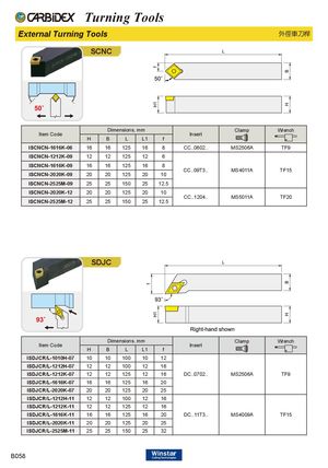 Turning Tools External Turning Tools 外徑車刀桿 SCNC Dimensions, mm Clamp Wrench Item Code Insert H B L L1 f ISCNCN-1616K-06 16 16 125 16 8 CC..0602.. MS2506A TF9 ISCNCN-1212K-09 12 12 125 12 6 ISCNCN-1616K-09 16 16 125 16 8 CC..09T3.. MS4011A TF15 ISCNCN-2020K-09 20 20 125 20 10 ISCNCN-2525M-09 25 25 150 25 12.5 ISCNCN-2020K-12 20 20 125 20 10 CC..1204.. MS5011A TF20 ISCNCN-2525M-12 25 25 150 25 12.5 SDJC Dimensions, mm Clamp Wrench Item Code Insert H B L L1 f ISDJCR/L-1010H-07 10 10 100 10 12 ISDJCR/L-1212H-07 12 12 100 12 16 ISDJCR/L-1212K-07 12 12 125 12 16 DC..0702.. MS2506A TF9 ISDJCR/L-1616K-07 16 16 125 16 20 ISDJCR/L-2020K-07 20 20 125 20 25 ISDJCR/L-1212H-11 12 12 100 12 16 ISDJCR/L-1212K-11 12 12 125 12 16 ISDJCR/L-1616K-11 16 16 125 16 20 DC..11T3.. MS4009A TF15 ISDJCR/L-2020K-11 20 20 125 20 25 ISDJCR/L-2525M-11 25 25 150 25 32 B058