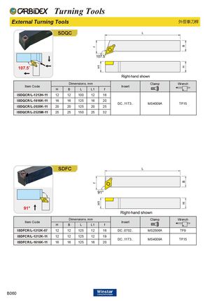 Turning Tools External Turning Tools 外徑車刀桿 SDQC Dimensions, mm Clamp Wrench Item Code Insert H B L L1 f ISDQCR/L-1212H-11 12 12 100 12 16 ISDQCR/L-1616K-11 16 16 125 16 20 DC..11T3.. MS4009A TF15 ISDQCR/L-2020K-11 20 20 125 20 25 ISDQCR/L-2525M-11 25 25 150 25 32 SDFC Dimensions, mm Clamp Wrench Item Code Insert H B L L1 f ISDFCR/L-1212K-07 12 12 125 12 16 DC..0702.. MS2506A TF9 ISDFCR/L-1212K-11 12 12 125 12 19 DC..11T3.. MS4009A TF15 ISDFCR/L-1616K-11 16 16 125 16 20 B060