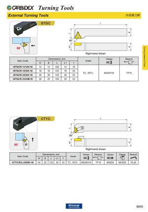 Turning Inserts & Tools Turning Tools External Turning Tools 外徑車刀桿 STGC Dimensions, mm Clamp Wrench Item Code Insert H B L L1 f ISTGCR-1212H-16 12 12 100 12 16 ISTGCR-1616K-16 16 16 125 16 20 TC..16T3.. MS4011A TF15 ISTGCR-2020K-16 20 20 125 20 25 ISTGCR-2525M-16 20 25 150 25 32 CTYC Dimensions, mm Screw Wrench Screw Clamp Wrench Item Code Insert H B L L1 f ICTYCR/L-2020K-16 20 20 125 20 25 TC..16T3.. MS4011A TF15 MS625 MC620 PL30 B065