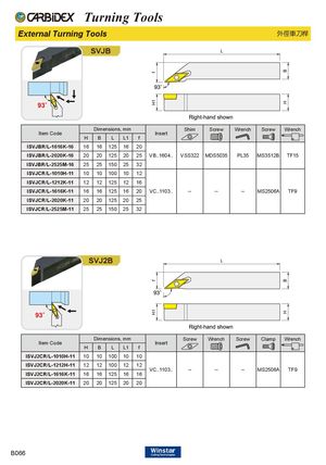 Turning Tools External Turning Tools 外徑車刀桿 SVJB Dimensions, mm Shim Screw Wrench Screw Wrench Item Code Insert H B L L1 f ISVJBR/L-1616K-16 16 16 125 16 20 ISVJBR/L-2020K-16 20 20 125 20 25 VB..1604.. VSS322 MDS5035 PL35 MS3512B TF15 ISVJBR/L-2525M-16 25 25 150 25 32 ISVJCR/L-1010H-11 10 10 100 10 12 ISVJCR/L-1212K-11 12 12 125 12 16 ISVJCR/L-1616K-11 16 16 125 16 20 VC..1103.. -- -- -- MS2506A TF9 ISVJCR/L-2020K-11 20 20 125 20 25 ISVJCR/L-2525M-11 25 25 150 25 32 SVJ2B Dimensions, mm Screw Wrench Screw Clamp Wrench Item Code Insert H B L L1 f ISVJ2CR/L-1010H-11 10 10 100 10 10 ISVJ2CR/L-1212H-11 12 12 100 12 12 VC..1103.. -- -- -- MS2506A TF9 ISVJ2CR/L-1616K-11 16 16 125 16 16 ISVJ2CR/L-2020K-11 20 20 125 20 20 B066