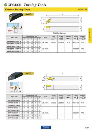 Turning Inserts & Tools Turning Tools External Turning Tools 外徑車刀桿 SVQB Dimensions, mm Shim Screw Wrench Screw Wrench Item Code Insert H B L L1 f ISVQBR/L-2020K-16 20 20 125 20 25 VB..1604.. VSS322 MDS5035 PL35 MS3512B TF15 ISVQBR/L-2525M-16 25 25 150 25 32 ISVQCR/L-1212H-11 12 12 100 12 16 ISVQCR/L-1616K-11 16 16 125 16 20 VC..1103.. -- -- -- MS2506A TF9 ISVQCR/L-2020K-11 20 20 125 20 25 SVVB Dimensions, mm Screw Wrench Screw Clamp Wrench Item Code Insert H B L L1 f ISVVBN-1616K-16 16 16 125 16 8 ISVVBN-2020K-16 20 20 125 20 10 VB..1604.. VSS322 MDS5035 PL35 MS3512B TF15 ISVVBN-2525M-16 25 25 150 25 12.5 ISVVBN-1010H-11 10 10 100 10 5 ISVVCN-1212K-11 12 12 125 12 6 ISVVCN-1616K-11 16 16 125 16 8 VC..1103.. -- -- -- MS2506A TF9 ISVVCN-2020K-11 20 20 125 20 10 ISVVCN-2525M-11 25 25 150 25 12.5 B067