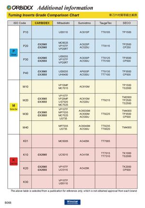 Additional information Turning Inserts Grade Comparison Chart 車刀片材質等級比較表 ISO Code CARBIDEX Mitsubishi Sumiotmo TaugeTec SECO P10 UE6110 AC810P TT8105 TP1500 P20 CX2565CX2565 MC6025VP15TFVP20RTAC820PAC520U TT8115 TP2500CP250 P Steel P30 CX2565CX2555 UE6035VP15TFVP20RTAC830PAC530U TT8125TT5100 TP3500CP500 P40 CX3565CX3555 UE6035 AP830PUH6400AC530UTT8135TT7100 TP3500CP500 M10 VP10MFMC7015 AC610M TP1500TS2000 M20 CX3565CX3555M VP15TFVP20MF AC610MUS7020AC520UMC7025TT9215 TM2000TP2500TS2500 Stainless Steel M30 CX3565CX3555 VP15TFMP7035MC7025US735AC6030MAC630MAC530UTT9225 TM4000TP3500CP500 M40 MP7035 AC6040M TT9235US735AC530UTT8020TM4000 K01 MC5005 AC405K TT7005 K10 CX2565 UC5015 AC415K TT7015TT7310 TK1000TS2000 K Cast Iron K20 CX2565CX2555 VP15TFUC5115 AC420K TK2000CP500 K30 VP15TFUE6110 The above table is selected from a publication for reference only, which is not obtained approval from each brand. B068