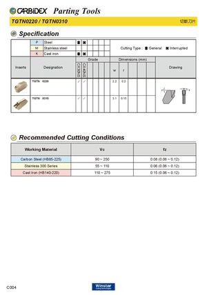 CX30NS CX40NS Parting Tools TGTN0220 / TGTN0310 切斷刀片 Specification P Steel M Stainless steel Cutting Type : General Interrupted K Cast iron Grade Dimensions (mm) Inserts Designation Drawing w r TGTN 0220 ✓ ✓ 2.2 0.2 TGTN 0310 ✓ ✓ 3.1 0.15 Recommended Cutting Conditions Working Material Vc fz Carbon Steel (HB85-225) 90 ~ 250 0.08 (0.06 ~ 0.12) Stainless 300 Series 55 ~ 110 0.06 (0.06 ~ 0.12) Cast Iron (HB140-220) 110 ~ 275 0.15 (0.06 ~ 0.12) C004
