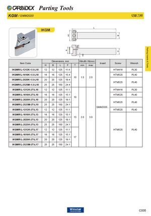 Parting Inserts & Tools Parting Tools KGM / GMM2020 切斷刀桿 IKGM Dimensions, mm Windth W(mm) Item Code Insert Screw Wrench H B L F T min max IKGMR/L-1212K-1.5-L10 12 12 125 11.4 HTM416 PL30 IKGMR/L-1616K-1.5-L10 16 16 125 15.4 HTM520 PL40 10 1.5 2.0 IKGMR/L-2020K-1.5-L10 20 20 125 19.4 HTM525 PL40 IKGMR/L-2525M-1.5-L10 25 25 150 24.4 IKGMR/L-1212K-2T-L10 12 12 125 11.1 HTM416 PL30 IKGMR/L-1616K-2T-L10 16 16 125 15.1 HTM520 PL40 10 IKGMR/L-2020K-2T-L10 20 20 125 19.1 HTM525 PL40 IKGMR/L-2525M-2T-L10 25 25 150 24.1 GMM2020... IKGMR/L-1212K-2T-L13 12 12 125 11.1 HTM520 PL40 IKGMR/L-1616K-2T-L13 16 16 125 15.1 13 2.0 3.0 IKGMR/L-2020K-2T-L13 20 20 125 19.1 IKGMR/L-2525K-2T-L13 25 25 150 24.1 IKGMR/L-1212K-2T-L17 12 12 125 11.1 HTM525 PL40 IKGMR/L-1616K-2T-L17 16 16 125 15.1 17 IKGMR/L-2020K-2T-L17 20 20 125 19.1 IKGMR/L-2525M-2T-L17 25 25 150 24.1 C005