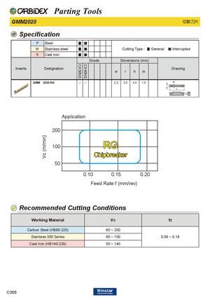 CX30NS CX40NS Vc (m/min) Parting Tools GMM2020 切斷刀片 Specification P Steel M Stainless steel Cutting Type : General Interrupted K Cast iron Grade Dimensions (mm) Inserts Designation Drawing w r h m GMM 2020-RG ✓ ✓ 2.2 2.0 4.3 1.5 Application 200 100 RG Chipbreaker 50 0.10 0.15 0.20 Feed Rate f (mm/rev) Recommended Cutting Conditions Working Material Vc fz Carbon Steel (HB85-225) 60 ~ 200 Stainless 300 Series 60 ~ 150 0.08 ~ 0.18 Cast Iron (HB140-220) 50 ~ 140 C006
