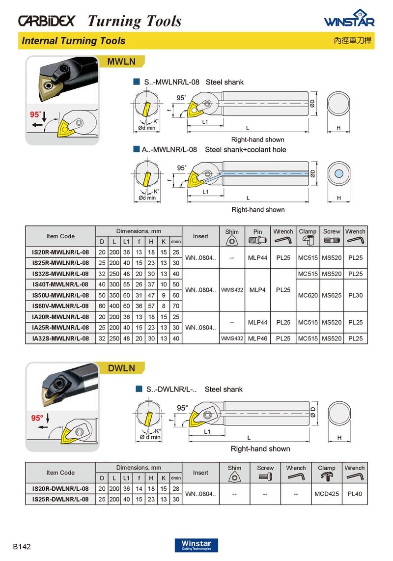 Turning Tools Internal Turning Tools 內徑車刀桿 MWLN Dimensions, mm Shim Pin Wrench Clamp Screw Wrench Item Code Insert D L L1 f H K dmin IS20R-MWLNR/L-08 20 200 36 13 18 15 25 WN..0804.. -- MLP44 PL25 MC515 MS520 PL25 IS25R-MWLNR/L-08 25 200 40 15 23 13 30 IS32S-MWLNR/L-08 32 250 48 20 30 13 40 MC515 MS520 PL25 IS40T-MWLNR/L-08 40 300 55 26 37 10 50 WN..0804.. WMS432 MLP4 PL25 IS50U-MWLNR/L-08 50 350 60 31 47 9 60 MC620 MS625 PL30 IS60V-MWLNR/L-08 60 400 60 36 57 8 70 IA20R-MWLNR/L-08 20 200 36 13 18 15 25 -- MLP44 PL25 MC515 MS520 PL25 IA25R-MWLNR/L-08 25 200 40 15 23 13 30 WN..0804.. IA32S-MWLNR/L-08 32 250 48 20 30 13 40 WMS432 MLP46 PL25 MC515 MS520 PL25 DWLN Dimensions, mm Shim Screw Wrench Clamp Wrench Item Code Insert D L L1 f H K dmin IS20R-DWLNR/L-08 20 200 36 14 18 15 28 WN..0804.. -- -- -- MCD425 PL40 IS25R-DWLNR/L-08 25 200 40 15 23 13 30 B142