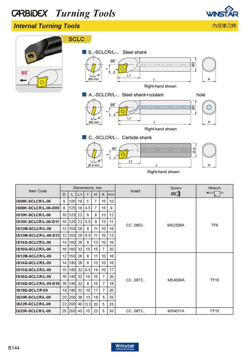 Turning Tools Internal Turning Tools 內徑車刀桿 SCLC Dimensions, mm Screw Wrench Item Code Insert D L L1 f H K dmin IS08K-SCLCR/L-06 8 125 18 5 7 15 10 IS08K-SCLCR/L-06-D09 8 125 18 4.5 7 15 9 IS10K-SCLCR/L-06 10 125 22 6 9 13 12 IS10K-SCLCR/L-06-D11 10 125 22 5.5 9 13 11 CC..0602.. MS2506A TF9 IS12M-SCLCR/L-06 12 150 26 8 11 10 16 IS12M-SCLCR/L-06-D13 12 150 26 6.5 11 10 13 IS14Q-SCLCR/L-06 14 180 26 8 13 10 16 IS16Q-SCLCR/L-06 16 180 32 10 15 7 20 IS12M-SCLCR/L-09 12 150 26 8 11 10 16 IS14Q-SCLCR/L-09 14 180 26 8 13 10 16 IS15Q-SCLCR/L-09 15 180 32 8.5 14 10 17 IS16Q-SCLCR/L-09 16 180 32 10 15 7 20 CC..09T3.. MS4009A TF15 IS16Q-SCLCR/L-09-D18 16 180 32 9 15 7 18 IS18Q-SCLCR-09 18 180 32 10 17 7 20 IS20R-SCLCR/L-09 20 200 36 13 18 5 25 IS22R-SCLCR/L-09 22 200 40 12.5 20 5 25 IS25R-SCLCR/L-09 25 200 40 15 23 5 30 CC..09T3.. MS4011A TF15 B144