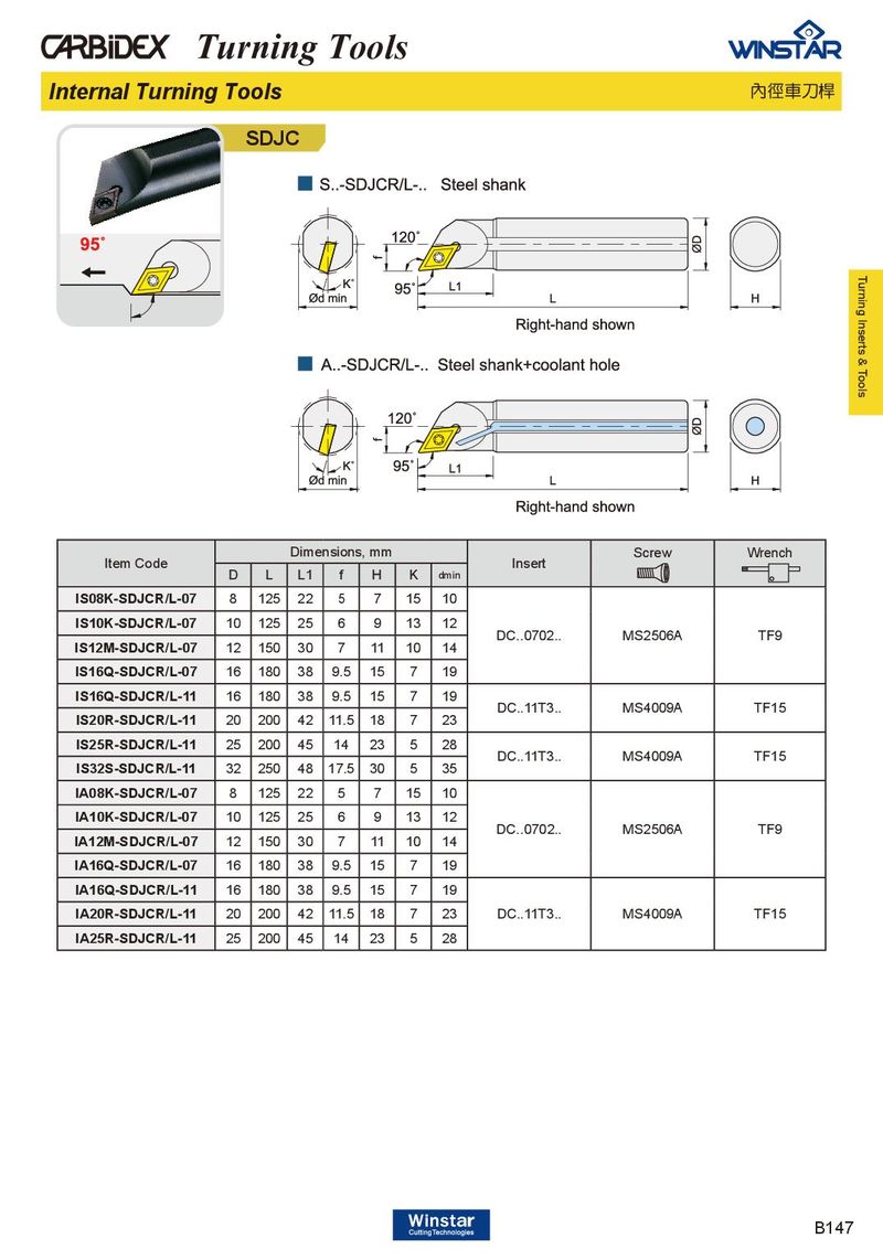 Turning Tools Internal Turning Tools 內徑車刀桿 SDJC Turning Inserts & Tools Dimensions, mm Screw Wrench Item Code Insert D L L1 f H K dmin IS08K-SDJCR/L-07 8 125 22 5 7 15 10 IS10K-SDJCR/L-07 10 125 25 6 9 13 12 DC..0702.. MS2506A TF9 IS12M-SDJCR/L-07 12 150 30 7 11 10 14 IS16Q-SDJCR/L-07 16 180 38 9.5 15 7 19 IS16Q-SDJCR/L-11 16 180 38 9.5 15 7 19 DC..11T3.. MS4009A TF15 IS20R-SDJCR/L-11 20 200 42 11.5 18 7 23 IS25R-SDJCR/L-11 25 200 45 14 23 5 28 DC..11T3.. MS4009A TF15 IS32S-SDJCR/L-11 32 250 48 17.5 30 5 35 IA08K-SDJCR/L-07 8 125 22 5 7 15 10 IA10K-SDJCR/L-07 10 125 25 6 9 13 12 DC..0702.. MS2506A TF9 IA12M-SDJCR/L-07 12 150 30 7 11 10 14 IA16Q-SDJCR/L-07 16 180 38 9.5 15 7 19 IA16Q-SDJCR/L-11 16 180 38 9.5 15 7 19 IA20R-SDJCR/L-11 20 200 42 11.5 18 7 23 DC..11T3.. MS4009A TF15 IA25R-SDJCR/L-11 25 200 45 14 23 5 28 B147