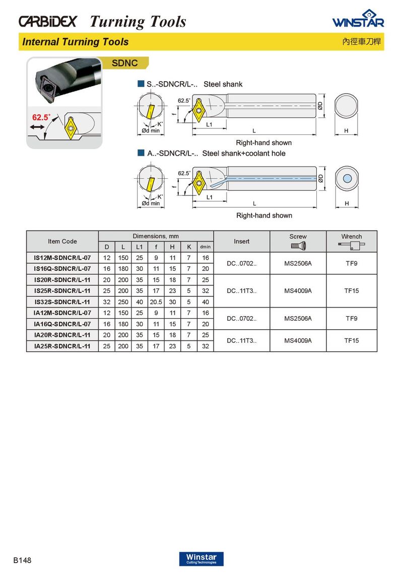 Turning Tools Internal Turning Tools 內徑車刀桿 SDNC Dimensions, mm Screw Wrench Item Code Insert D L L1 f H K dmin IS12M-SDNCR/L-07 12 150 25 9 11 7 16 DC..0702.. MS2506A TF9 IS16Q-SDNCR/L-07 16 180 30 11 15 7 20 IS20R-SDNCR/L-11 20 200 35 15 18 7 25 IS25R-SDNCR/L-11 25 200 35 17 23 5 32 DC..11T3.. MS4009A TF15 IS32S-SDNCR/L-11 32 250 40 20.5 30 5 40 IA12M-SDNCR/L-07 12 150 25 9 11 7 16 DC..0702.. MS2506A TF9 IA16Q-SDNCR/L-07 16 180 30 11 15 7 20 IA20R-SDNCR/L-11 20 200 35 15 18 7 25 DC..11T3.. MS4009A TF15 IA25R-SDNCR/L-11 25 200 35 17 23 5 32 B148