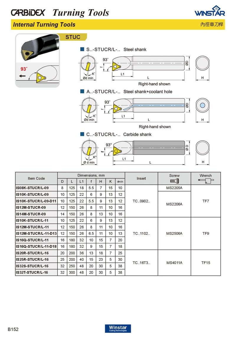 Turning Tools Internal Turning Tools 內徑車刀桿 STUC Dimensions, mm Screw Wrench Item Code Insert D L L1 f H K dmin IS08K-STUCR/L-09 8 125 18 5.5 7 15 10 MS2205A IS10K-STUCR/L-09 10 125 22 6 9 13 12 IS10K-STUCR/L-09-D11 10 125 22 5.5 9 13 12 TC..0902.. TF7 MS2206A IS12M-STUCR-09 12 150 26 8 11 10 16 IS14M-STUCR-09 14 150 26 8 13 10 16 IS10K-STUCR/L-11 10 125 22 6 9 13 12 IS12M-STUCR/L-11 12 150 26 8 11 10 16 IS12M-STUCR/L-11-D13 12 150 26 6.5 11 10 13 TC..1102.. MS2506A TF9 IS16Q-STUCR/L-11 16 180 32 10 15 7 20 IS16Q-STUCR/L-11-D18 16 180 32 9 15 7 18 IS20R-STUCR/L-16 20 200 36 13 18 7 25 IS25R-STUCR/L-16 25 200 40 15 23 5 30 TC..16T3.. MS4011A TF15 IS32S-STUCR/L-16 32 250 48 20 30 5 38 IS32T-STUCR/L-16 32 300 48 20 30 5 38 B152