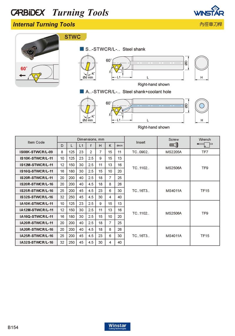 Turning Tools Internal Turning Tools 內徑車刀桿 STWC Dimensions, mm Screw Wrench Item Code Insert D L L1 f H K dmin IS08K-STWCR/L-09 8 125 23 2 7 15 11 TC..0902.. MS2205A TF7 IS10K-STWCR/L-11 10 125 23 2.5 9 15 13 IS12M-STWCR/L-11 12 150 30 2.5 11 13 16 TC..1102.. MS2506A TF9 IS16Q-STWCR/L-11 16 180 30 2.5 15 10 20 IS20R-STWCR/L-11 20 200 40 2.5 18 7 25 IS20R-STWCR/L-16 20 200 40 4.5 18 8 26 IS25R-STWCR/L-16 25 200 45 4.5 23 6 30 TC..16T3.. MS4011A TF15 IS32S-STWCR/L-16 32 250 45 4.5 30 4 40 IA10K-STWCR/L-11 10 125 23 2.5 9 15 13 IA12M-STWCR/L-11 12 150 30 2.5 11 13 16 TC..1102.. MS2506A TF9 IA16Q-STWCR/L-11 16 180 30 2.5 15 10 20 IA20R-STWCR/L-11 20 200 40 2.5 18 7 25 IA20R-STWCR/L-16 20 200 40 4.5 18 8 26 IA25R-STWCR/L-16 25 200 45 4.5 23 6 30 TC..16T3.. MS4011A TF15 IA32S-STWCR/L-16 32 250 45 4.5 30 4 40 B154