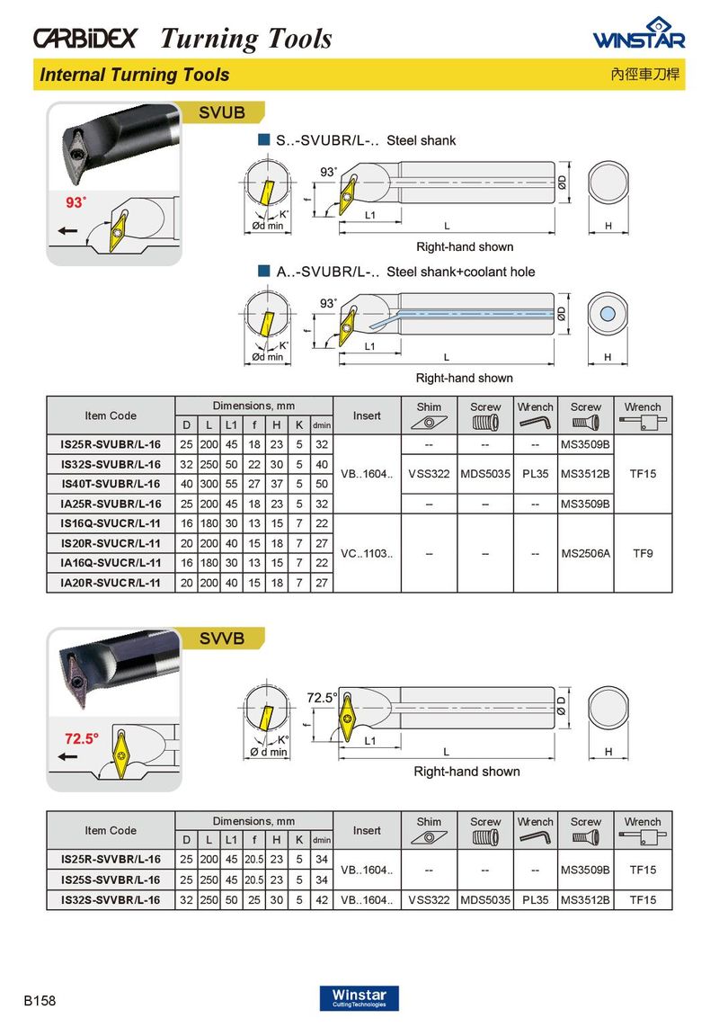 Turning Tools Internal Turning Tools 內徑車刀桿 SVUB Dimensions, mm Shim Screw Wrench Screw Wrench Item Code Insert D L L1 f H K dmin IS25R-SVUBR/L-16 25 200 45 18 23 5 32 -- -- -- MS3509B IS32S-SVUBR/L-16 32 250 50 22 30 5 40 VB..1604.. VSS322 MDS5035 PL35 MS3512B TF15 IS40T-SVUBR/L-16 40 300 55 27 37 5 50 IA25R-SVUBR/L-16 25 200 45 18 23 5 32 -- -- -- MS3509B IS16Q-SVUCR/L-11 16 180 30 13 15 7 22 IS20R-SVUCR/L-11 20 200 40 15 18 7 27 VC..1103.. -- -- -- MS2506A TF9 IA16Q-SVUCR/L-11 16 180 30 13 15 7 22 IA20R-SVUCR/L-11 20 200 40 15 18 7 27 SVVB Dimensions, mm Shim Screw Wrench Screw Wrench Item Code Insert D L L1 f H K dmin IS25R-SVVBR/L-16 25 200 45 20.5 23 5 34 VB..1604.. -- -- -- MS3509B TF15 IS25S-SVVBR/L-16 25 250 45 20.5 23 5 34 IS32S-SVVBR/L-16 32 250 50 25 30 5 42 VB..1604.. VSS322 MDS5035 PL35 MS3512B TF15 B158
