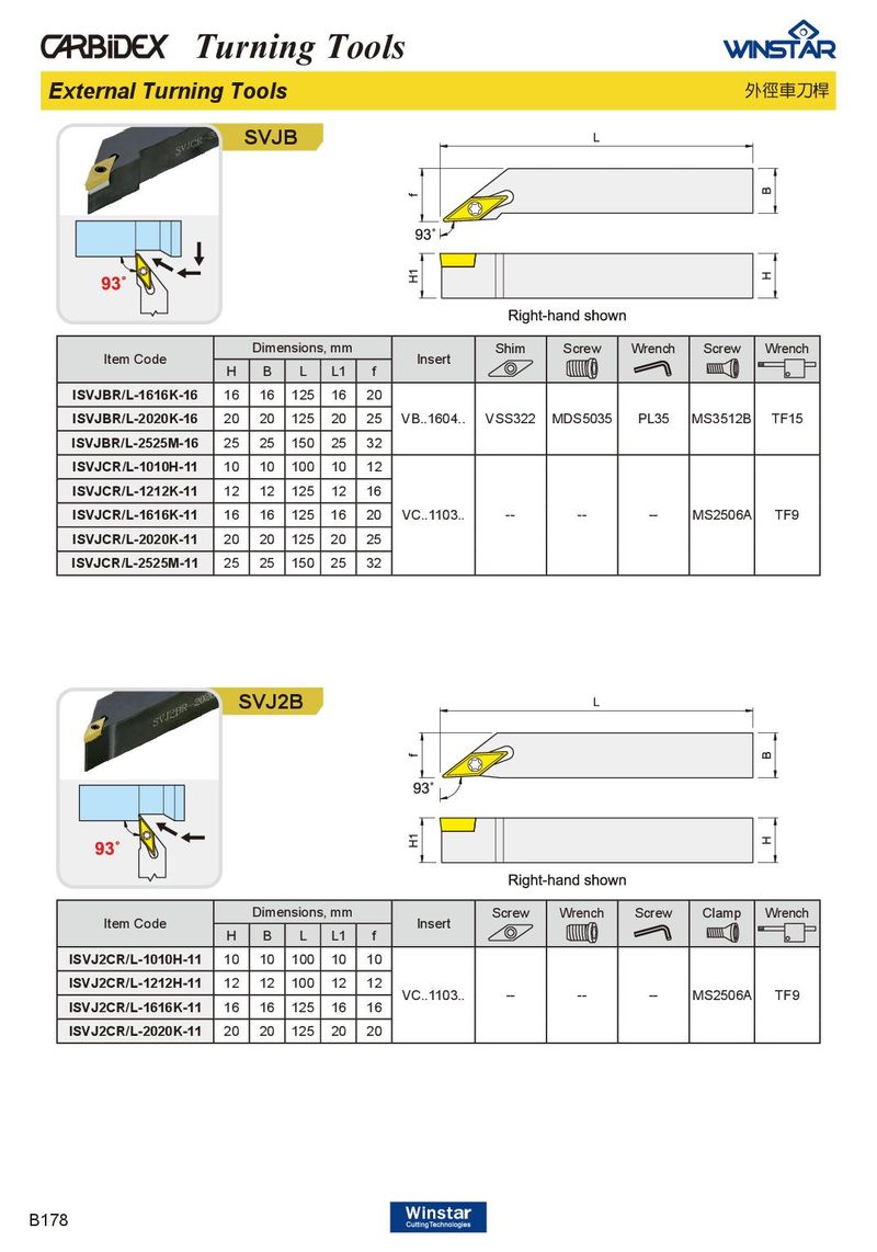 Turning Tools External Turning Tools 外徑車刀桿 SVJB Dimensions, mm Shim Screw Wrench Screw Wrench Item Code Insert H B L L1 f ISVJBR/L-1616K-16 16 16 125 16 20 ISVJBR/L-2020K-16 20 20 125 20 25 VB..1604.. VSS322 MDS5035 PL35 MS3512B TF15 ISVJBR/L-2525M-16 25 25 150 25 32 ISVJCR/L-1010H-11 10 10 100 10 12 ISVJCR/L-1212K-11 12 12 125 12 16 ISVJCR/L-1616K-11 16 16 125 16 20 VC..1103.. -- -- -- MS2506A TF9 ISVJCR/L-2020K-11 20 20 125 20 25 ISVJCR/L-2525M-11 25 25 150 25 32 SVJ2B Dimensions, mm Screw Wrench Screw Clamp Wrench Item Code Insert H B L L1 f ISVJ2CR/L-1010H-11 10 10 100 10 10 ISVJ2CR/L-1212H-11 12 12 100 12 12 VC..1103.. -- -- -- MS2506A TF9 ISVJ2CR/L-1616K-11 16 16 125 16 16 ISVJ2CR/L-2020K-11 20 20 125 20 20 B178