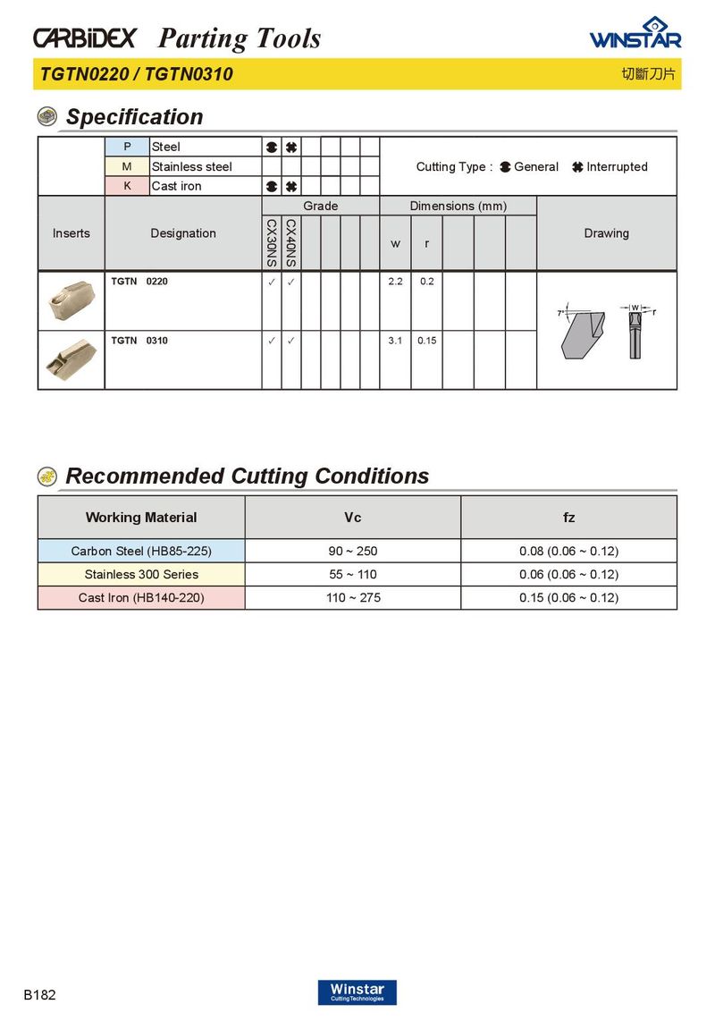 Parting Tools TGTN0220 / TGTN0310 切斷刀片 Specification P Steel M Stainless steel Cutting Type : General Interrupted K Cast iron Grade Dimensions (mm) CX30NS CX40NS Inserts Designation Drawing w r TGTN 0220 ✓ ✓ 2.2 0.2 TGTN 0310 ✓ ✓ 3.1 0.15 Recommended Cutting Conditions Working Material Vc fz Carbon Steel (HB85-225) 90 ~ 250 0.08 (0.06 ~ 0.12) Stainless 300 Series 55 ~ 110 0.06 (0.06 ~ 0.12) Cast Iron (HB140-220) 110 ~ 275 0.15 (0.06 ~ 0.12) B182