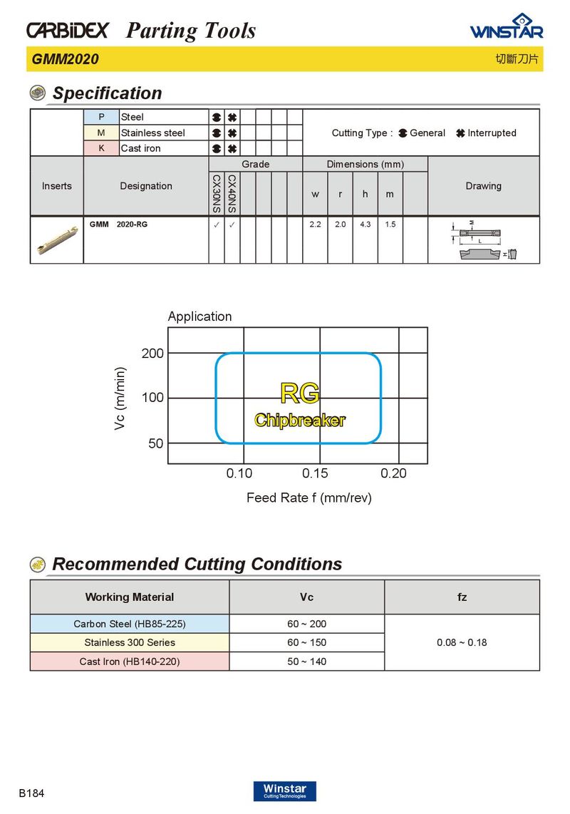 Parting Tools GMM2020 切斷刀片 Specification P Steel M Stainless steel Cutting Type : General Interrupted K Cast iron Grade Dimensions (mm) CX30NS CX40NS Inserts Designation Drawing w r h m GMM 2020-RG ✓ ✓ 2.2 2.0 4.3 1.5 Application 200 100 RG Chipbreaker Vc (m/min) 50 0.10 0.15 0.20 Feed Rate f (mm/rev) Recommended Cutting Conditions Working Material Vc fz Carbon Steel (HB85-225) 60 ~ 200 Stainless 300 Series 60 ~ 150 0.08 ~ 0.18 Cast Iron (HB140-220) 50 ~ 140 B184