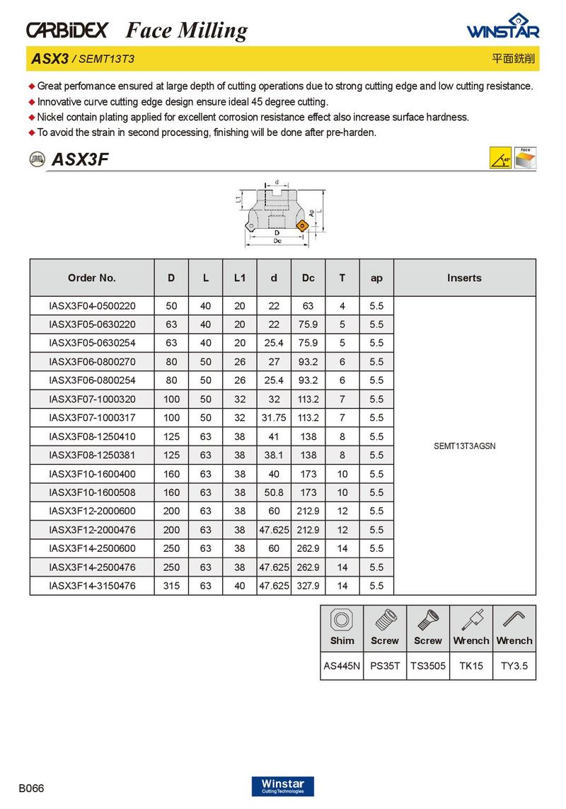 Face Milling ASX3 / SEMT13T3 平面銑削 ♦ Great perfomance ensured at large depth of cutting operations due to strong cutting edge and low cutting resistance. ♦ Innovative curve cutting edge design ensure ideal 45 degree cutting. ♦ Nickel contain plating applied for excellent corrosion resistance effect also increase surface hardness. ♦ To avoid the strain in second processing, finishing will be done after pre-harden. ASX3F Order No. D L L1 d Dc T ap Inserts IASX3F04-0500220 50 40 20 22 63 4 5.5 IASX3F05-0630220 63 40 20 22 75.9 5 5.5 IASX3F05-0630254 63 40 20 25.4 75.9 5 5.5 IASX3F06-0800270 80 50 26 27 93.2 6 5.5 IASX3F06-0800254 80 50 26 25.4 93.2 6 5.5 IASX3F07-1000320 100 50 32 32 113.2 7 5.5 IASX3F07-1000317 100 50 32 31.75 113.2 7 5.5 IASX3F08-1250410 125 63 38 41 138 8 5.5 SEMT13T3AGSN IASX3F08-1250381 125 63 38 38.1 138 8 5.5 IASX3F10-1600400 160 63 38 40 173 10 5.5 IASX3F10-1600508 160 63 38 50.8 173 10 5.5 IASX3F12-2000600 200 63 38 60 212.9 12 5.5 IASX3F12-2000476 200 63 38 47.625 212.9 12 5.5 IASX3F14-2500600 250 63 38 60 262.9 14 5.5 IASX3F14-2500476 250 63 38 47.625 262.9 14 5.5 IASX3F14-3150476 315 63 40 47.625 327.9 14 5.5 Shim Screw Screw Wrench Wrench AS445N PS35T TS3505 TK15 TY3.5 B066