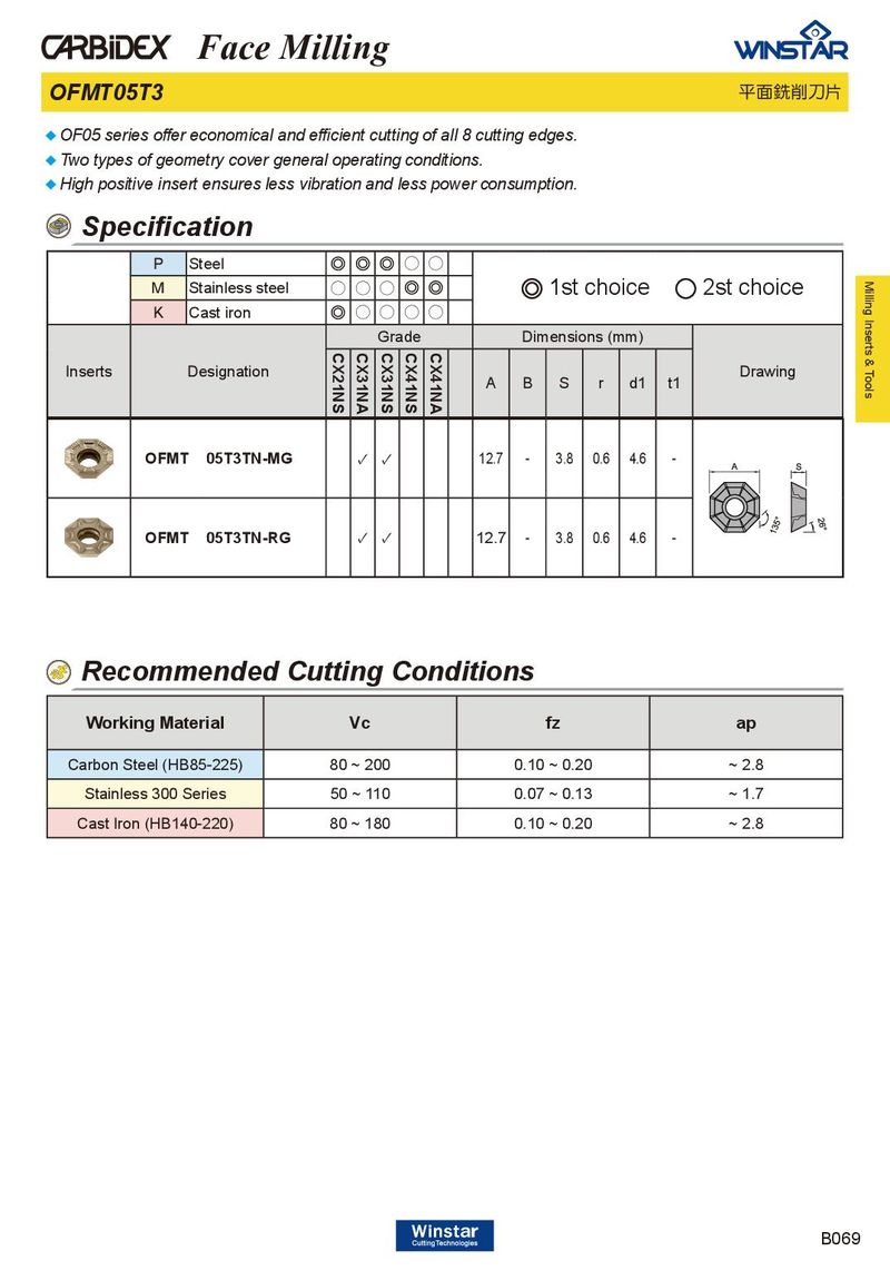 Face Milling OFMT05T3 平面銑削刀片 ♦ OF05 series offer economical and efficient cutting of all 8 cutting edges. ♦ Two types of geometry cover general operating conditions. ♦ High positive insert ensures less vibration and less power consumption. Specification P Steel ◎ ◎ ◎ ○ ○ Milling Inserts & Tools M Stainless steel ○ ○ ○ ◎ ◎ 1st choice 2st choice K Cast iron ◎ ○ ○ ○ ○ Grade Dimensions (mm) CX21NS CX31NA CX31NS CX41NS CX41NA Inserts Designation Drawing A B S r d1 t1 OFMT 05T3TN-MG ✓ ✓ 12.7 - 3.8 0.6 4.6 - OFMT 05T3TN-RG ✓ ✓ 12.7 - 3.8 0.6 4.6 - Recommended Cutting Conditions Working Material Vc fz ap Carbon Steel (HB85-225) 80 ~ 200 0.10 ~ 0.20 ~ 2.8 Stainless 300 Series 50 ~ 110 0.07 ~ 0.13 ~ 1.7 Cast Iron (HB140-220) 80 ~ 180 0.10 ~ 0.20 ~ 2.8 B069