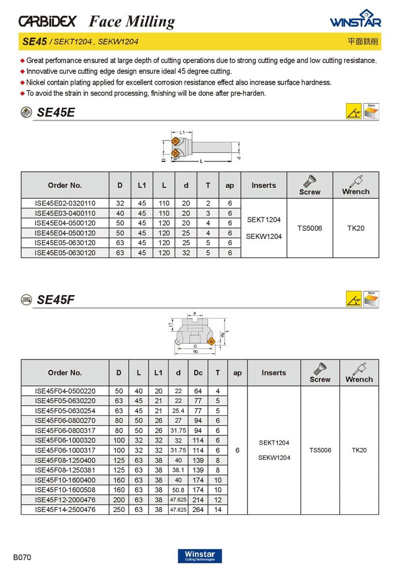 Face Milling SE45 / SEKT1204 , SEKW1204 平面銑削 ♦ Great perfomance ensured at large depth of cutting operations due to strong cutting edge and low cutting resistance. ♦ Innovative curve cutting edge design ensure ideal 45 degree cutting. ♦ Nickel contain plating applied for excellent corrosion resistance effect also increase surface hardness. ♦ To avoid the strain in second processing, finishing will be done after pre-harden. SE45E ap Order No. D L1 L d T ap Inserts Screw Wrench ISE45E02-0320110 32 45 110 20 2 6 ISE45E03-0400110 40 45 110 20 3 6 SEKT1204 ISE45E04-0500120 50 45 120 20 4 6 TS5006 TK20 ISE45E04-0500120 50 45 120 25 4 6 SEKW1204 ISE45E05-0630120 63 45 120 25 5 6 ISE45E05-0630120 63 45 120 32 5 6 SE45F Order No. D L L1 d Dc T ap Inserts Screw Wrench ISE45F04-0500220 50 40 20 22 64 4 ISE45F05-0630220 63 45 21 22 77 5 ISE45F05-0630254 63 45 21 25.4 77 5 ISE45F06-0800270 80 50 26 27 94 6 ISE45F06-0800317 80 50 26 31.75 94 6 ISE45F06-1000320 100 32 32 32 114 6 SEKT1204 ISE45F06-1000317 100 32 32 31.75 114 6 6 TS5006 TK20 SEKW1204 ISE45F08-1250400 125 63 38 40 139 8 ISE45F08-1250381 125 63 38 38.1 139 8 ISE45F10-1600400 160 63 38 40 174 10 ISE45F10-1600508 160 63 38 50.8 174 10 ISE45F12-2000476 200 63 38 47.625 214 12 ISE45F14-2500476 250 63 38 47.625 264 14 B070