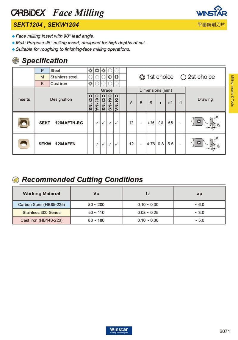 Face Milling SEKT1204 , SEKW1204 平面銑削刀片 ♦ Face milling insert with 90° lead angle. ♦ Multi Purpose 45° milling insert, designed for high depths of cut. ♦ Suitable for roughing to finishing-face milling operations. Specification P Steel ◎ ◎ ◎ ○ ○ Milling Inserts & Tools M Stainless steel ○ ○ ○ ◎ ◎ 1st choice 2st choice K Cast iron ◎ ○ ○ ○ ○ Grade Dimensions (mm) CX21NS CX31NA CX31NS CX41NS CX41NA Inserts Designation Drawing A B S r d1 t1 SEKT 1204AFTN-RG ✓ ✓ ✓ ✓ 12 - 4.76 0.8 5.5 - SEKW 1204AFEN ✓ ✓ ✓ ✓ 12 - 4.76 0.8 5.5 - Recommended Cutting Conditions Working Material Vc fz ap Carbon Steel (HB85-225) 80 ~ 200 0.10 ~ 0.30 ~ 6.0 Stainless 300 Series 50 ~ 110 0.08 ~ 0.25 ~ 3.0 Cast Iron (HB140-220) 80 ~ 180 0.10 ~ 0.30 ~ 5.0 B071