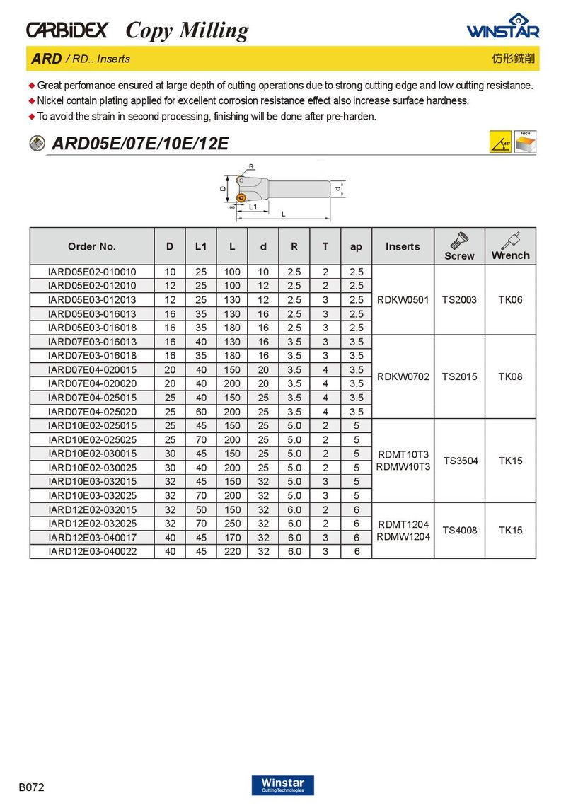 Copy Milling ARD / RD.. Inserts 仿形銑削 ♦ Great perfomance ensured at large depth of cutting operations due to strong cutting edge and low cutting resistance. ♦ Nickel contain plating applied for excellent corrosion resistance effect also increase surface hardness. ♦ To avoid the strain in second processing, finishing will be done after pre-harden. ARD05E/07E/10E/12E ap Order No. D L1 L d R T ap Inserts Screw Wrench IARD05E02-010010 10 25 100 10 2.5 2 2.5 IARD05E02-012010 12 25 100 12 2.5 2 2.5 IARD05E03-012013 12 25 130 12 2.5 3 2.5 RDKW0501 TS2003 TK06 IARD05E03-016013 16 35 130 16 2.5 3 2.5 IARD05E03-016018 16 35 180 16 2.5 3 2.5 IARD07E03-016013 16 40 130 16 3.5 3 3.5 IARD07E03-016018 16 35 180 16 3.5 3 3.5 IARD07E04-020015 20 40 150 20 3.5 4 3.5 RDKW0702 TS2015 TK08 IARD07E04-020020 20 40 200 20 3.5 4 3.5 IARD07E04-025015 25 40 150 25 3.5 4 3.5 IARD07E04-025020 25 60 200 25 3.5 4 3.5 IARD10E02-025015 25 45 150 25 5.0 2 5 IARD10E02-025025 25 70 200 25 5.0 2 5 IARD10E02-030015 30 45 150 25 5.0 2 5 RDMT10T3 TS3504 TK15 IARD10E02-030025 30 40 200 25 5.0 2 5 RDMW10T3 IARD10E03-032015 32 45 150 32 5.0 3 5 IARD10E03-032025 32 70 200 32 5.0 3 5 IARD12E02-032015 32 50 150 32 6.0 2 6 IARD12E02-032025 32 70 250 32 6.0 2 6 RDMT1204 TS4008 TK15 IARD12E03-040017 40 45 170 32 6.0 3 6 RDMW1204 IARD12E03-040022 40 45 220 32 6.0 3 6 B072