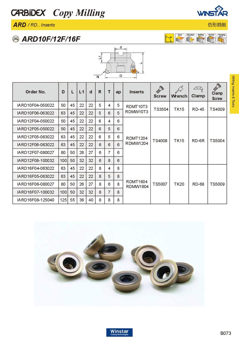 Copy Milling ARD / RD.. Inserts 仿形銑削 ARD10F/12F/16F ap Milling Inserts & Tools Order No. D L L1 d R T ap Inserts Clamp Screw Wrench Clamp Screw IARD10F04-050022 50 45 22 22 5 4 5 RDMT10T3 TS3504 TK15 RD-45 TS4009 RDMW10T3 IARD10F06-063022 63 45 22 22 5 6 5 IARD12F04-050022 50 45 22 22 6 4 6 IARD12F05-050022 50 45 22 22 6 5 6 IARD12F05-063022 63 45 22 22 6 5 6 RDMT1204 TS4008 TK15 RD-6R TS5004 RDMW1204 IARD12F06-063022 63 45 22 22 6 6 6 IARD12F07-080027 80 50 26 27 6 7 6 IARD12F08-100032 100 50 32 32 6 8 6 IARD16F04-063022 63 45 22 22 8 4 8 IARD16F05-063022 63 45 22 22 8 5 8 RDMT1604 IARD16F06-080027 80 50 26 27 8 6 8 TS5007 TK20 RD-68 TS5009 RDMW1604 IARD16F07-100032 100 50 32 32 8 7 8 IARD16F08-125040 125 55 36 40 8 8 8 B073