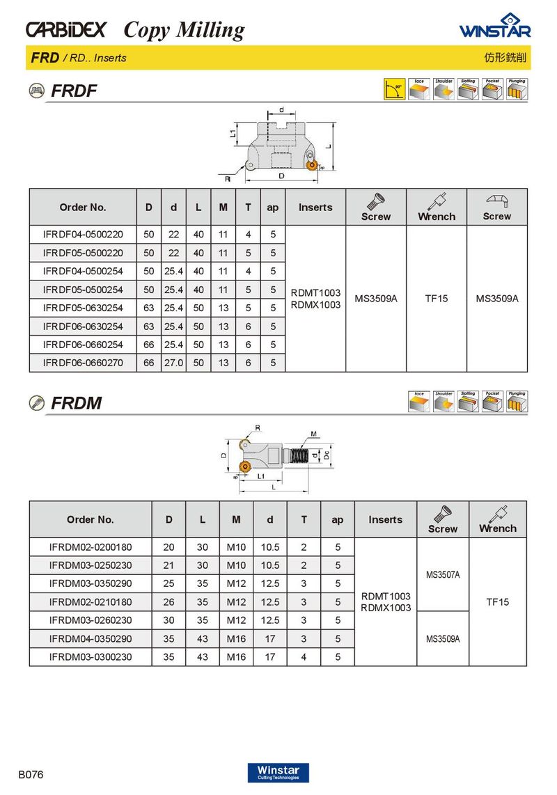 Copy Milling FRD / RD.. Inserts 仿形銑削 FRDF ap Order No. D d L M T ap Inserts Screw Wrench Screw IFRDF04-0500220 50 22 40 11 4 5 IFRDF05-0500220 50 22 40 11 5 5 IFRDF04-0500254 50 25.4 40 11 4 5 IFRDF05-0500254 50 25.4 40 11 5 5 RDMT1003 MS3509A TF15 MS3509A RDMX1003 IFRDF05-0630254 63 25.4 50 13 5 5 IFRDF06-0630254 63 25.4 50 13 6 5 IFRDF06-0660254 66 25.4 50 13 6 5 IFRDF06-0660270 66 27.0 50 13 6 5 FRDM ap Order No. D L M d T ap Inserts Screw Wrench IFRDM02-0200180 20 30 M10 10.5 2 5 IFRDM03-0250230 21 30 M10 10.5 2 5 MS3507A IFRDM03-0350290 25 35 M12 12.5 3 5 RDMT1003 IFRDM02-0210180 26 35 M12 12.5 3 5 TF15 RDMX1003 IFRDM03-0260230 30 35 M12 12.5 3 5 IFRDM04-0350290 35 43 M16 17 3 5 MS3509A IFRDM03-0300230 35 43 M16 17 4 5 B076
