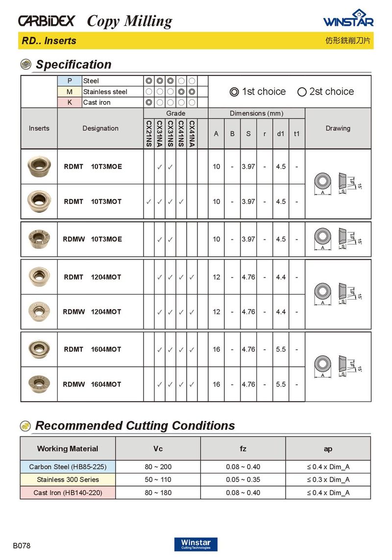 Copy Milling RD.. Inserts 仿形銑削刀片 Specification P Steel ◎ ◎ ◎ ○ ○ M Stainless steel ○ ○ ○ ◎ ◎ 1st choice 2st choice K Cast iron ◎ ○ ○ ○ ○ Grade Dimensions (mm) CX21NS CX31NA CX31NS CX41NS CX41NA Inserts Designation Drawing A B S r d1 t1 RDMT 10T3MOE ✓ ✓ 10 - 3.97 - 4.5 - RDMT 10T3MOT ✓ ✓ ✓ ✓ 10 - 3.97 - 4.5 - RDMW 10T3MOE ✓ ✓ 10 - 3.97 - 4.5 - RDMT 1204MOT ✓ ✓ ✓ ✓ 12 - 4.76 - 4.4 - RDMW 1204MOT ✓ ✓ ✓ ✓ 12 - 4.76 - 4.4 - RDMT 1604MOT ✓ ✓ ✓ ✓ 16 - 4.76 - 5.5 - RDMW 1604MOT ✓ ✓ ✓ ✓ 16 - 4.76 - 5.5 - Recommended Cutting Conditions Working Material Vc fz ap Carbon Steel (HB85-225) 80 ~ 200 0.08 ~ 0.40 ≤ 0.4 x Dim_A Stainless 300 Series 50 ~ 110 0.05 ~ 0.35 ≤ 0.3 x Dim_A Cast Iron (HB140-220) 80 ~ 180 0.08 ~ 0.40 ≤ 0.4 x Dim_A B078