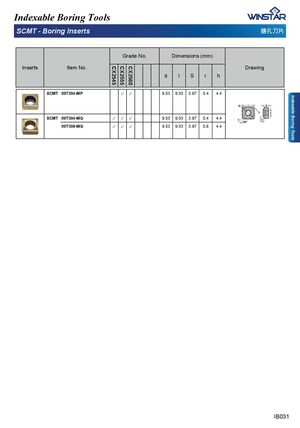 CX2545 CX2555 CX2560 Indexable Boring Tools Indexable Boring Tools 6&07%RULQJ,QVHUWV 㖹ⳣ⎏䏖 Grade No. Dimensions (mm) Inserts Item No. Drawing d l S r h SCMT 09T304-MP ✓ ✓ 9.53 9.53 3.97 0.4 4.4 SCMT 09T304-MG ✓ ✓ ✓ 9.53 9.53 3.97 0.4 4.4 09T308-MG ✓ ✓ ✓ 9.53 9.53 3.97 0.8 4.4 IB031