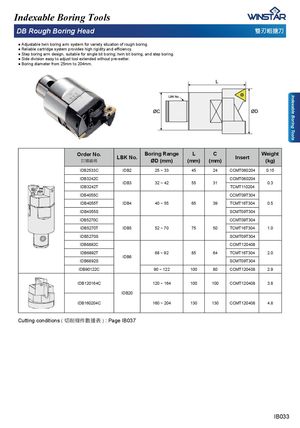 Indexable Boring Tools Indexable Boring Tools '%5RXJK%RULQJ+HDG 桨⎒並㖹⎏ Ɣ $GMXVWDEOHWZLQERULQJDUPV\VWHPIRUYDULHW\VLWXDWLRQRIURXJKERULQJ Ɣ 5HOLDEOHFDUWULGJHV\VWHPSURYLGHVKLJKULJLGLW\DQGHႈFLHQF\ Ɣ Step boring arm design, suitable for single bit boring, twin bit boring, and step boring. Ɣ 6LGHGLYLVLRQHDV\WRDGMXVWWRROH[WHQGHGZLWKRXWSUHVHWWHU Ɣ Boring diameter from 25mm to 204mm. Order No.宑庋佷䩋 LBK No. Boring RangeØD (mm) L(mm) C(mm) Insert Weight(kg) IDB2533C IDB2 25 ~ 33 45 24 CCMT060204 0.15 IDB3242C CCMT060204 IDB3 32 ~ 42 55 31 0.3 IDB3242T TCMT110204 IDB4055C CCMT09T304 IDB4055T IDB4 40 ~ 55 65 39 TCMT16T304 0.5 IDB4055S SCMT09T304 IDB5270C CCMT09T304 IDB5270T IDB5 52 ~ 70 75 50 TCMT16T304 1.0 IDB5270S SCMT09T304 IDB6892C CCMT120408 IDB6892T 68 ~ 92 85 64 TCMT16T304 2.0 IDB6 IDB6892S SCMT09T304 IDB90122C 90 ~ 122 100 80 CCMT120408 2.9 IDB120164C 120 ~ 164 100 100 CCMT120408 3.8 IDB20 IDB160204C 160 ~ 204 130 130 CCMT120408 4.8 Cutting conditions ( ⎖⏙㨬₅㜇㙩姷 ) : Page IB037 IB033