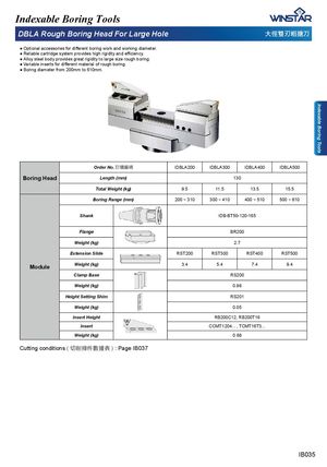 Indexable Boring Tools Indexable Boring Tools '%/$5RXJK%RULQJ+HDG)RU/DUJH+ROH ⪶ㄠ桨⎒並㖹⎏ Ɣ 2SWLRQDODFFHVVRULHVIRUGLႇHUHQWERULQJZRUNDQGZRUNLQJGLDPHWHU Ɣ 5HOLDEOHFDUWULGJHV\VWHPSURYLGHVKLJKULJLGLW\DQGHႈFLHQF\ Ɣ $OOR\VWHHOERG\SURYLGHVJUHDWULJLGLW\WRODUJHVL]HURXJKERULQJ Ɣ 9DULDEOHLQVHUWVIRUGLႇHUHQWPDWHULDORIURXJKERULQJ Ɣ Boring diameter from 200mm to 610mm. 2UGHU1R宑庋佷䩋 IDBLA200 IDBLA300 IDBLA400 IDBLA500 Boring Head /HQJWKPP 130 7RWDO:HLJKWNJ 9.5 11.5 13.5 15.5 %RULQJ5DQJHPP 200 ~ 310 300 ~ 410 400 ~ 510 500 ~ 610 6KDQN IDB-BT50-120-165 Flange BR200 :HLJKWNJ 2.7 ([WHQVLRQ6OLGH RST200 RST300 RST400 RST500 Module :HLJKWNJ 3.4 5.4 7.4 9.4 &ODPS%DVH RS200 :HLJKWNJ 0.98 +HLJKW6HWWLQJ6KLP RS201 :HLJKWNJ 0.05 ,QVHUW+HLJKW RB200C12, RB200T16 ,QVHUW CCMT1204... , TCMT16T3... :HLJKWNJ 0.68 Cutting conditions ( ⎖⏙㨬₅㜇㙩姷 ) : Page IB037 IB035