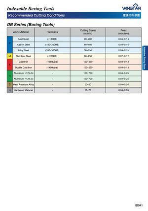 Indexable Boring Tools Indexable Boring Tools 5HFRPPHQGHG&XWWLQJ&RQGLWLRQV ら峿⎖⏙╒㜇 DB Series (Boring Tools) Work Material Hardness Cutting Speed(m/min) FeedPPUHY Mild Steel (<180HB) 90~200 0.04~0.14 P Cabon Steel (180~280HB) 60~180 0.04~0.15 Alloy Steel (280~350HB) 50~150 0.04~0.15 M Stainless Steel (<200HB) 60~230 0.07~0.12 Cast lron (<350Mpa) 120~230 0.04~0.13 K Ductile Cast lron (<450Mpa) 120~230 0.04~0.13 Aluminum <12% Si - 120~700 0.04~0.25 N Aluminum >12% Si - 120~700 0.04~0.25 S Heat Resistant Alloy - 20~80 0.04~0.05 H Hardened Material - 20~70 0.04~0.05 IB041