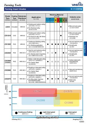 Cutting Speed Turning Tools Turning Tools Turning Insert Grades 恙⎏䏖㣟幹䳘亩 Working Material Grade Coating SubstrateTypeTypeHardnessApplication⽴䐈ㆶ㣟幹槭⎴⧦ⷳ䮽槭⦉㣟䧻〵 ⽴㣟幹 Industry areaPMKNSH䚱㫼㍘䚷䵓⢜ P1~P3 P4~P6 ƔFinishing and medium cutting !!懸䚷㝋乍⽴☛ᾼ⽴CX10UncoatedHRA 93Ɣ)RU$OXPLQXPDOOR\ β Ɣ%LNHDQGDXWRSDUWV!!卹姛恙☛㸌恙梅₅ !!懸▗摐▗捠恙⏙ ƔFinishing and medium cutting Ɣ%LNHDQGDXWRSDUWV CX1010 CVD HRA 93 !!懸䚷㝋乍⽴☛ᾼ⽴ƔFor Aluminum alloy with Silicon !!卹姛恙☛㸌恙梅₅βƔ$OXPLQLXPULP !!懸▗►䦌摐▗捠恙⏙ !!摐▗捠撋⢗ Ɣ&RQWLQXRXV¿QLVKLQJFXWWLQJ ƔAuto and machinery parts CX1555 PVD HRA 92 !!懸䚷㝋憲倛ㆶ乍⽴Ɣ)RU¿QLVKLQJDSSOLFDWLRQ !!㸌恙☛㯮㨿梅₅ββββΰββƔ$LUFUDIWSDUWV !!懸▗⪶₌扷捠ⷻ㣟幹乍ⅽ恙⏙ !!厹⪹梅₅ ƔGood for work hardening cutting ƔAuto and machinery parts CX2545 PVD HRA 91.6 !!懸䚷㝋⎖⏙⽴䧻⒥⽴₅Ɣ)RUStainless steel & Superalloyΰΰ β !!㸌恙☛㯮㨿梅₅βΰƔ$LUFUDIWSDUWV !!懸▗ᾜ斌撋☛汧䀺▗捠恙⏙ !!厹⪹梅₅ ƔMedium or light interrupted cutting CX2560 PVD(CX2555) !!懸䚷㝋ᾼ⽴㎥悤㝆倛⽴HRA 91.6Ɣ)RUCarbon Steel Ɣ&DUERQVWHHOSDUWVβΰΰΰΰΰmanufacturing!!䩂撋梅₅媌憯 !!懸▗䩂撋恙⏙ ƔRoughing or interrupted cutting CX3560 PVD HRA 90.5 !!懸䚷㝋並⽴㎥㝆倛⽴Ɣ)RUCarbon Steel β ΰ ΰ ΰ ΰ ΰ ƔSteel parts manufacturing!!撋旄梅₅媌憯 !!懸▗䩂撋恙⏙ CX3575 CVD ƔRoughing or interrupted cutting!!懸䚷㝋並⽴㎥㝆倛⽴HRA 90.5Ɣ)RU$OOR\VWHHO&DVW,URQββΰβand Hardened steel!!懸▗▗捠撋 - 旓旄☛汧䧻〵撋恙⏙ƔAuto and machinery parts!!㸌恙☛㯮㨿梅₅ΰβƔ0ROGGLH!!㮰⌆䚱㫼 ⎖ ⏙ 憮 〵 200 CX2560 CX3575 (m/min) 130 CX2555 CX3560 60 Continuous Cutting Light Interrupted Interrupted 憲倛ㆶ⽴ 悤㝆倛⽴ 㝆倛⽴ Application Range for Steel Finishing 乍⽴ Roughing 並⽴ IC003