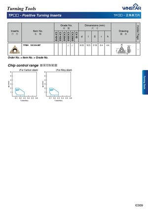 CX1010 CX1555 CX2545 CX2555 CX2560 CX10 Holder Page Turning Tools ap (mm) ap (mm) Turning Tools TPΩΩ - Positive Turning Inserts TPΩΩ . 㳲孡恙⎏䏖 Grade No. Dimensions (mm) 㣟!!幹 ⷉ!!ⶇ Inserts Item No. Drawing ⎏!!䏖 ▜!!䯀 ⢥!!ヱ d l S r h TPMH 160304-MP ✓ ✓ 9.53 16.5 3.18 0.4 4.4 - Order No. = Item No. + Grade No. Chip control range 㝆ⷠ㔶⏅䵓⢜ (For Carbon steel) (For Alloy steel) 6 6 5 5 4 4 3 3 2 2 MP MP 1 1 0.1 0.2 0.3 0.4 0.5 0.6 0.1 0.2 0.3 0.4 0.5 0.6 f (mm/rev) f (mm/rev) IC009