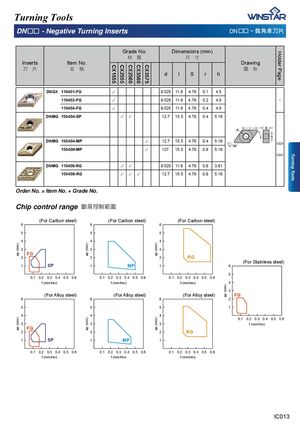 CX1555 CX2555 CX2560 CX3560 CX3575 Holder Page Turning Tools Turning Tools DNΩΩ - Negative Turning Inserts DNΩΩ . 帯孡恙⎏䏖 Grade No. Dimensions (mm) 㣟!!幹 ⷉ!!ⶇ Inserts Item No. Drawing ⎏!!䏖 ▜!!䯀 ⢥!!ヱ d l S r h DNGX 110401-FG ✓ 9.525 11.6 4.76 0.1 4.5 110402-FG ✓ 9.525 11.6 4.76 0.2 4.5 - 110404-FG ✓ 9.525 11.6 4.76 0.4 4.5 DNMG 150404-SP ✓ ✓ 12.7 15.5 4.76 0.4 5.16 DNMG 150404-MP ✓ 12.7 15.5 4.76 0.4 5.16 IC024 150408-MP ✓ 127. 15.5 4.76 0.8 5.16 IC047 DNMG 110408-RG ✓ ✓ 9.525 11.6 4.76 0.8 3.81 150408-RG ✓ ✓ ✓ 12.7 15.5 4.76 0.8 5.16 Order No. = Item No. + Grade No. Chip control range 㝆ⷠ㔶⏅䵓⢜ (For Carbon steel) (For Carbon steel) (For Carbon steel) 6 6 6 5 5 5 4 4 4 3 3 3 FG2 2 2 RG 1 SP 1 MP 1 (For Stainless steel)6 5 0.1 0.2 0.3 0.4 0.5 0.6 0.1 0.2 0.3 0.4 0.5 0.6 0.1 0.2 0.3 0.4 0.5 0.6 f (mm/rev) f (mm/rev) f (mm/rev) 4 3 (For Alloy steel) (For Alloy steel) (For Alloy steel) FG 6 6 6 2 5 5 5 1 4 4 4 0.1 0.2 0.3 0.4 0.5 0.6 3 3 3 f (mm/rev) FG 2 2 2 RG 1 SP 1 MP 1 0.1 0.2 0.3 0.4 0.5 0.6 0.1 0.2 0.3 0.4 0.5 0.6 0.1 0.2 0.3 0.4 0.5 0.6 f (mm/rev) f (mm/rev) f (mm/rev) IC013 ap (mm)ap (mm) ap (mm)ap (mm) ap (mm)ap (mm) ap (mm)