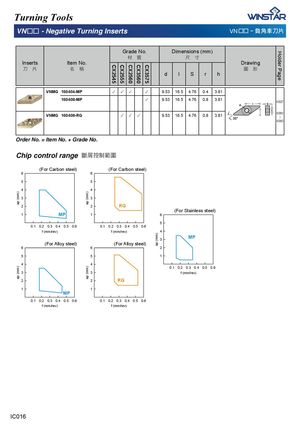 CX2545 CX2555 CX2560 CX3560 CX3575 Holder Page ap (mm)ap (mm) ap (mm)ap (mm) ap (mm) Turning Tools VNΩΩ - Negative Turning Inserts VNΩΩ . 帯孡恙⎏䏖 Grade No. Dimensions (mm) 㣟!!幹 ⷉ!!ⶇ Inserts Item No. Drawing ⎏!!䏖 ▜!!䯀 ⢥!!ヱ d l S r h VNMG 160404-MP ✓ ✓ ✓ ✓ 9.53 16.5 4.76 0.4 3.81 160408-MP ✓ 9.53 16.5 4.76 0.8 3.81 IC027 VNMG 160408-RG ✓ ✓ ✓ 9.53 16.5 4.76 0.8 3.81 IC051~ IC052 Order No. = Item No. + Grade No. Chip control range 㝆ⷠ㔶⏅䵓⢜ (For Carbon steel) (For Carbon steel) 6 6 5 5 4 4 3 3 2 2 RG (For Stainless steel) 1 MP 1 6 5 0.1 0.2 0.3 0.4 0.5 0.6 0.1 0.2 0.3 0.4 0.5 0.6 f (mm/rev) f (mm/rev) 4 3 MP (For Alloy steel) (For Alloy steel) 6 6 2 5 5 1 4 4 0.1 0.2 0.3 0.4 0.5 0.6 3 3 f (mm/rev) 2 2 RG 1 1 MP 0.1 0.2 0.3 0.4 0.5 0.6 0.1 0.2 0.3 0.4 0.5 0.6 f (mm/rev) f (mm/rev) IC016