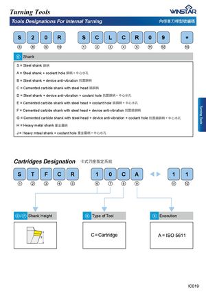 Turning Tools Turning Tools Tools Designations For Internal Turning ⋶ㄠ恙⎏㨎⤚埮佷䩋 S 2 0 R S C L C R 0 9 Shank S = Steel shank 撋㥓 A = Steel shank + coolant hole 撋㥓 , ᾼㅒ㷃ⳣ B = Steel shank + device anti-vibration 㐦梖撋㥓 C = Cemented carbide shank with steel head 攱撋㥓 D = Steel shank + device anti-vibration + coolant hole 㐦梖撋㥓 , ᾼㅒ㷃ⳣ E = Cemented carbide shank with steel head + coolant hole 攱撋㥓 , ᾼㅒ㷃ⳣ F = Cemented carbide shank with steel head + device anti-vibration 㐦梖攱撋㥓 G = Cemented carbide shank with steel head + device anti-vibration + coolant hole 㐦梖攱撋㥓 , ᾼㅒ㷃ⳣ H = Heavy metal shank 捜捠ⷻ㥓 J = Heavy mteal shank + coolant hole 捜捠ⷻ㥓 , ᾼㅒ㷃ⳣ Cartridges Designation !⓰ゞ⎏〶㒖亊伀 S T F C R 1 0 C A 1 1 / Shank Height Type of Tool Execution IC019