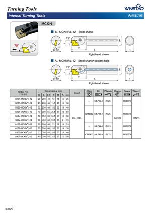 Turning Tools Internal Turning Tools ⋶ㄠ恙⎏㨎 MCKN Order No.宑庋佷䩋 Dimensions, mm Insert Shim Pin Wrench Clamp Screw WrenchDLL1fHKdmin IS20R-MCKNR/L-12 20 200 40 13 18 15 25 -- IMLP44-A IPL25 IMS620TX IS25R-MCKNR/L-12 25 200 40 15.5 23 13 30 IS32S-MCKNR/L-12 32 250 48 19.5 30 13 40 IS40T-MCKNR/L-12 40 300 55 25.5 37 12 50 ICMS432 IMLP46-A IPL25 IMS625TX IS50U-MCKNR/L-12 50 350 60 30.5 47 10 60 CN..1204.. IMC620 IETL15 IS60V-MCKNR/L-12 60 400 60 35.5 57 9 70 IA20R-MCKNR/L-12 20 200 40 13 18 15 25 -- IMLP44-A IPL25 IMS620TX IA25R-MCKNR/L-12 25 200 40 15.5 23 13 30 IA32S-MCKNR/L-12 32 250 48 19.5 30 13 40 ICMS432 IMLP46-A IPL25 IMS625TX IA40T-MCKNR/L-12 40 300 55 25.5 37 12 50 IC022