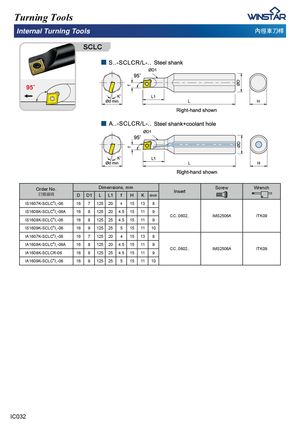 Turning Tools Internal Turning Tools ⋶ㄠ恙⎏㨎 SCLC Order No.宑庋佷䩋 Dimensions, mm InsertDD1LL1fHKdmin Screw Wrench IS1607K-SCLCR/L-06 16 7 125 20 4 15 13 8 IS1608K-SCLCR/L-06A 16 8 125 20 4.5 15 11 9 CC..0602.. IMS2506A ITK09 IS1608K-SCLCR/L-06 16 8 125 25 4.5 15 11 9 IS1609K-SCLCR/L-06 16 9 125 25 5 15 11 10 IA1607K-SCLCR/L-06 16 7 125 20 4 15 13 8 IA1608K-SCLCR/L-06A 16 8 125 20 4.5 15 11 9 CC..0602.. IMS2506A ITK09 IA1608K-SCLCR-06 16 8 125 25 4.5 15 11 9 IA1609K-SCLCR/L-06 16 9 125 25 5 15 11 10 IC032