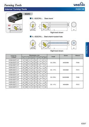 Turning Tools Turning Tools Internal Turning Tools ⋶ㄠ恙⎏㨎 SDZC Order No.宑庋佷䩋 Dimensions, mm InsertDLL1L2fHKdmin Screw Wrench IS10M-SDZCR/L-07 10 150 12 18 8.5 9 13 14 IS12M-SDZCR/L-07 12 150 12 20 10.5 11 10 17 DC..0702.. IMS2506B ITK09 IS16Q-SDZCR/L-07 16 180 12 26 12.5 15 7 21 IS20R-SDZCR/L-11 20 200 18 27 15.5 18 7 26 IS25R-SDZCR/L-11 25 200 18 32 18 23 5 33 DC..11T3.. IMS4009A ITK15 IS32S-SDZCR/L-11 32 250 18 42 21.5 30 5 40 IA10M-SDZCR/L-07 10 150 12 18 8.5 9 13 14 IA12M-SDZCR/L-07 12 150 12 20 10.5 11 10 17 DC..0702.. IMS2506B0 ITK09 IA16Q-SDZCR/L-07 16 180 12 26 12.5 15 7 21 IA20R-SDZCR/L-11 20 200 18 27 15.5 18 7 26 IA25R-SDZCR/L-11 25 200 18 32 18 23 5 33 DC..11T3.. IMS4009A ITK15 IA32S-SDZCR/L-11 32 250 18 42 21.5 30 5 40 IC037
