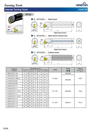 Turning Tools Internal Turning Tools ⋶ㄠ恙⎏㨎 STUC Order No.宑庋佷䩋 Dimensions, mm InsertDLL1fHKdmin Screw Wrench IS08K-STUCR/L-09 8 125 20 5.5 7 15 10 IMS2205A IS10K-STUCR/L-09 10 125 22 6 9 13 12 IS10K-STUCR/L-09-D11 10 125 22 5.5 9 13 11 TC..0902.. IMS2206A ITK07 IS12M-STUCR-09 12 150 26 8 11 10 16 IS14M-STUCR-09 14 150 26 8 13 10 16 IS10K-STUCR/L-11 10 125 22 6 9 13 12 IS12M-STUCR/L-11 12 150 26 8 11 10 16 IS12M-STUCR/L-11-D13 12 150 26 6.5 11 10 13 TC..1102.. IMS2506A ITK09 IS16Q-STUCR/L-11 16 180 32 10 15 7 20 IS16Q-STUCR/L-11-D18 16 180 32 9 15 7 18 IS20R-STUCR/L-16 20 200 40 13 18 7 25 IS25R-STUCR/L-16 25 200 40 15 23 5 30 TC..16T3.. IMS4011A ITK15 IS32S-STUCR/L-16 32 250 48 20 30 5 38 IS32T-STUCR/L-16 32 300 48 20 30 5 38 IC038