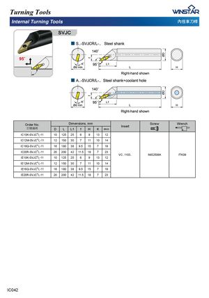 Turning Tools Internal Turning Tools ⋶ㄠ恙⎏㨎 SVJC Order No.宑庋佷䩋 Dimensions, mm InsertDLL1fHKdmin Screw Wrench IC10K-SVJCR/L-11 10 125 25 6 9 13 12 IC12M-SVJCR/L-11 12 150 30 7 11 10 14 IC16Q-SVJCR/L-11 16 180 38 9.5 15 7 19 IC20R-SVJCR/L-11 20 200 42 11.5 18 7 23 VC..1103.. IMS2506A ITK09 IE10K-SVJCR/L-11 10 125 25 6 9 13 12 IE12M-SVJCR/L-11 12 150 30 7 11 10 14 IE16Q-SVJCR/L-11 16 180 38 9.5 15 7 19 IE20R-SVJCR/L-11 20 200 42 11.5 18 7 23 IC042