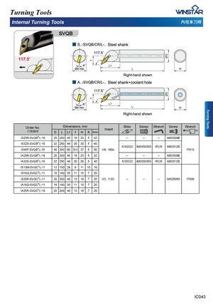 ff ØDØD Turning Tools Turning Tools Internal Turning Tools ⋶ㄠ恙⎏㨎 SVQB L1 L L1 L Order No.宑庋佷䩋 Dimensions, mm Shim Screw Wrench Screw WrenchInsertDLL1fHKdmin IS25R-SVQBR/L-16 25 200 45 16 23 5 32 -- -- -- IMS3509B IS32S-SVQBR/L-16 32 250 48 20 30 5 40 IVSS322 IMDS5035S IPL35 IMS3512B IS40T-SVQBR/L-16 40 300 60 25.5 37 5 50 VB..1604.. ITK15 IA25R-SVQBR/L-16 25 200 45 16 23 5 32 -- -- -- IMS3509B IA32S-SVQBR/L-16 32 250 48 20 30 5 40 IVSS322 IMDS5035S IPL35 IMS3512B IS12M-SVQCR/L-11 12 150 28 9 11 10 16 IS16Q-SVQCR/L-11 16 180 35 11 15 7 20 IS20R-SVQCR/L-11 20 200 40 13 18 7 25 VC..1103.. -- -- -- IMS2506A ITK09 IA16Q-SVQCR/L-11 16 180 35 11 15 7 20 IA25R-SVQCR/L-16 20 200 40 13 18 7 25 IC043