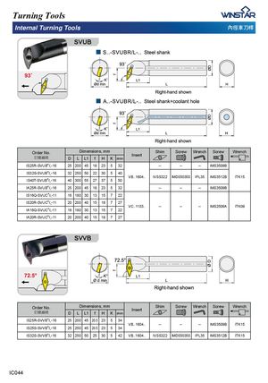 Turning Tools Internal Turning Tools ⋶ㄠ恙⎏㨎 SVUB Order No.宑庋佷䩋 Dimensions, mm Insert Shim Screw Wrench Screw WrenchDLL1fHKdmin IS25R-SVUBR/L-16 25 200 45 18 23 5 32 -- -- -- IMS3509B IS32S-SVUBR/L-16 32 250 50 22 30 5 40 VB..1604.. IVSS322 IMDS5035S IPL35 IMS3512B ITK15 IS40T-SVUBR/L-16 40 300 55 27 37 5 50 IA25R-SVUBR/L-16 25 200 45 18 23 5 32 -- -- -- IMS3509B IS16Q-SVUCR/L-11 16 180 30 13 15 7 22 IS20R-SVUCR/L-11 20 200 40 15 18 7 27 VC..1103.. -- -- -- IMS2506A ITK09 IA16Q-SVUCR/L-11 16 180 30 13 15 7 22 IA20R-SVUCR/L-11 20 200 40 15 18 7 27 SVVB Order No.宑庋佷䩋 Dimensions, mm Insert Shim Screw Wrench Screw WrenchDLL1fHKdmin IS25R-SVVBR/L-16 25 200 45 20.5 23 5 34 VB..1604.. -- -- -- IMS3509B ITK15 IS25S-SVVBR/L-16 25 250 45 20.5 23 5 34 IS32S-SVVBR/L-16 32 250 50 25 30 5 42 VB..1604.. IVSS322 IMDS5035S IPL35 IMS3512B ITK15 IC044