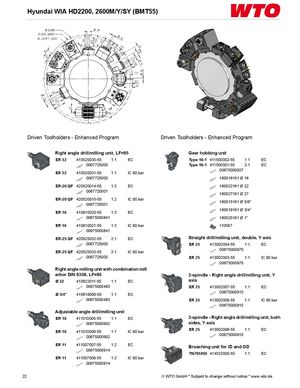 Hyundai WIA HD2200, 2600M/Y/SY (BMT55) Driven Toolholders - Enhanced Program Driven Toolholders - Enhanced Program Right angle drill/milling unit, LF=85 Gear hobbing unit ER 32 410520030-55 1:1 EC Type 16-1 411500002-55 1:1 EC 0067725000 Type 16-1 411500001-55 2:1 EC 00675000927 ER 32 410520031-55 1:1 IC 80 bar 0067725000 160016161 Ø 16 ER-20 QF 420520014-55 1:2 EC 160022161 Ø 22 0067720001 160027161 Ø 27 ER-20 QF 420520015-55 1:2 IC 80 bar0067720001 160015161 Ø 5/8" ER 16 410810020-55 1:3 EC 160019161 Ø 3/4" 00675000841 160025161 Ø 1" ER 16 410810021-55 1:3 IC 80 bar 110587 00675000841 ER-25 QF 420525032-55 2:1 EC Straight drill/milling unit, double, Y axis 0067725000 ER 25 413002004-55 1:1 EC ER-25 QF 420525033-55 2:1 IC 80 bar 00675000970 0067725000 ER 25 413002003-55 1:1 IC 80 bar 00675000970 Right angle milling unit with combination mill arbor DIN 6358, LF=85 2-spindle - Right angle drill/milling unit, Y Ø 22 410622011-55 1:1 EC axis 00675000483 ER 25 413502007-55 1:1 EC Ø 3/4" 410619006-55 1:1 EC 00675000915 00675000483 ER 25 413502008-55 1:1 IC 80 bar 00675000915 Adjustable angle drill/milling unit ER 16 411010005-55 1:1 EC 2-spindle - Right angle drill/milling unit, both 00675000902 sides, Y axis ER 16 411010006-55 1:1 IC 80 bar ER 25 413502006-55 1:1 EC 00675000902 00675000915 ER 11 411007007-55 1:2 EC Broaching unit for ID and OD 00675000914 TN765050 414532000-55 1:1 EC ER 11 411007008-55 1:2 IC 80 bar 00675000914 22 © WTO GmbH * Subject to change without notice * www.wto.de