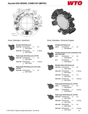 Hyundai WIA HD2600, 3100M/Y/SY (BMT65) Driven Toolholders - QuickFlex® Driven Toolholders - Enhanced Program Straight drill/milling unit Straight drill/milling unit ER-32 QF 420132015-65 1:1 EC ER 40 410126001-65 1:1 EC 0067732000 00675000079 ER-32 QF 420132016-65 1:1 IC 80 bar 0067732000 Straight milling unit with combination mill arbor DIN 6358 Right angle drill/milling unit, LF=100 Ø 22 410222002-65 1:1 EC ER-32 QF 420532018-65 1:1 EC 00675000483 0067732000 Ø 1" 410225002-65 1:1 EC ER-32 QF 420532019-65 1:1 IC 80 bar 00675000483 0067732000 Straight offset drill/milling unit Right angle drill/milling unit, both sides, ER-32 QF 420132037-65 1:1 EC LF=100 0067732000 ER-32 QF 420532020-65 1:1 EC ER-32 QF 420132038-65 1:1 IC 80 bar 0067732000 0067732000 ER-25 QF 420125010-65 1:2 EC 0067725001 ER-25 QF 420125011-65 1:2 IC 80 bar 0067725001 Right angle drill/milling unit, LF=100 ER 40 410526007-65 1:1 EC 00675000079 ER 40 410526008-65 1:1 IC 80 bar 00675000079 Right angle drill/milling unit, LF=100 ER-25 QF 420525012-65 1:2 EC 0067725001 ER-25 QF 420525013-65 1:2 IC 80 bar 0067725001 ER-32 QF 420532029-65 2:1 EC 0067732000 ER-32 QF 420532030-65 2:1 IC 80 bar © WTO GmbH * Subject to change without notice * www.wto.de 0067732000 25