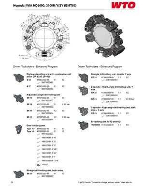 Hyundai WIA HD2600, 3100M/Y/SY (BMT65) Driven Toolholders - Enhanced Program Driven Toolholders - Enhanced Program Right angle milling unit with combination mill Straight drill/milling unit, double, Y axis arbor DIN 6358, LF=100 ER 25 413002004-65 1:1 EC Ø 22 410622002-65 1:1 EC 00675000907 00675000483 Ø 1" 410625002-65 1:1 EC 2-spindle - Right angle drill/milling unit, Y 00675000483 axis ER 25 413502006-65 1:1 EC Adjustable angle drill/milling unit 00675000915 ER 16 411010002-65 1:1 EC ER 25 413502007-65 1:1 IC 80 bar 00675000902 00675000915 ER 16 411010003-65 1:1 IC 80 bar 00675000902 2-spindle - Right angle drill/milling unit, both ER 11 411007002-65 1:2 EC sides, Y axis 00675000914 ER 25 413502008-65 1:1 EC ER 11 411007003-65 1:2 IC 80 bar 00675000915 00675000914 Broaching unit for ID and OD Gear hobbing unit TN765050 414532000-65 1:1 EC Type 16-1 411500003-65 1:1 EC Type 16-1 411500002-65 2:1 EC 00675000927 160016161 Ø 16 160022161 Ø 22 160027161 Ø 27 160015161 Ø 5/8" 160019161 Ø 3/4" 160025161 Ø 1" 160031161 Ø 1 1/4" 110587 Straight drill/milling unit, both sides ER 25 413002001-65 1:1 EC 00675000907 26 © WTO GmbH * Subject to change without notice * www.wto.de