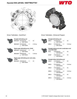 Hyundai WIA LM1600, 1800TTMS/TTSY Driven Toolholders - QuickFlex® Driven Toolholders - Enhanced Program Straight drill/milling unit Straight drill/milling unit ER-25 QF 420125015-55 1:1 EC ER 32 410120010-55 1:1 EC 0067725000 0067725000 ER-25 QF 420125016-55 1:1 IC 80 bar ER 32 410120011-55 1:1 IC 80 bar 0067725000 0067725000 Right angle drill/milling unit, LF=85 Straight milling unit with combination mill ER-25 QF 420525018-55 1:1 EC arbor DIN 6358 0067725000 Ø 22 410222004-55 1:1 EC ER-25 QF 420525019-55 1:1 IC 80 bar 00675000483 0067725000 Ø 3/4" 410219002-55 1:1 EC 00675000483 Right angle drill/milling unit, both sides, LF=85 Straight offset drill/milling unit ER-25 QF 420525020-55 1:1 EC ER 25 410116029-55 1:1 EC 0067725000 00675000932 ER 25 410116030-55 1:1 IC 80 bar 00675000932 ER 20 410113009-55 1:2 EC 00675000939 ER 20 410113010-55 1:2 IC 80 bar 00675000939 ER 16 410410004-55 1:3 EC 00675000937 ER 16 410410005-55 1:3 IC 80 bar 00675000937 28 © WTO GmbH * Subject to change without notice * www.wto.de